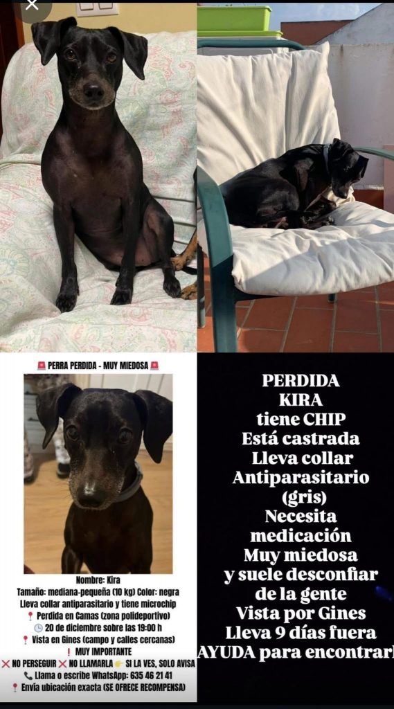 Kira, una perra de color negro, castrada, con microchip y collar antiparasitario gris, se perdió el pasado 20 de diciembre alrededor de las 19:00 horas en la zona de Camas, cerca del polideportivo, y ha sido vista posteriormente por el área de Gines y campos cercanos.