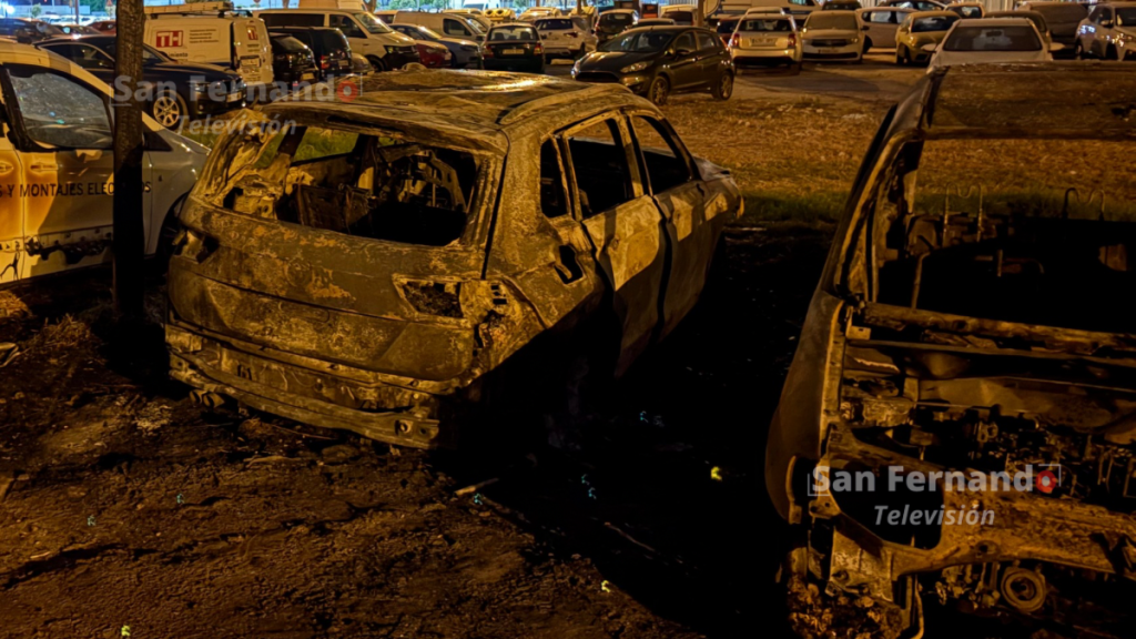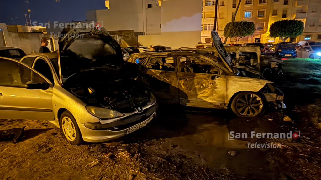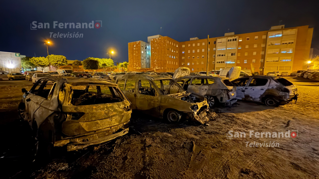 Un aparatoso incendio ocurrido en la noche de este sábado en San Fernando ha calcinado por completo cinco vehículos y ha afectado a más de una decena, generando gran alarma entre los vecinos de la zona de la avenida San Juan Bosco con San Vicente, junto a las dependencias de la Policía Local.