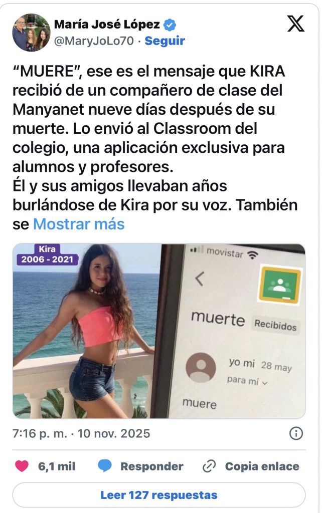 Kira López, que según la familia llevaba años sufriendo burlas y maltrato por parte de compañeros desde que era una niña, se suicidó con 15 años el 19 de mayo de 2021