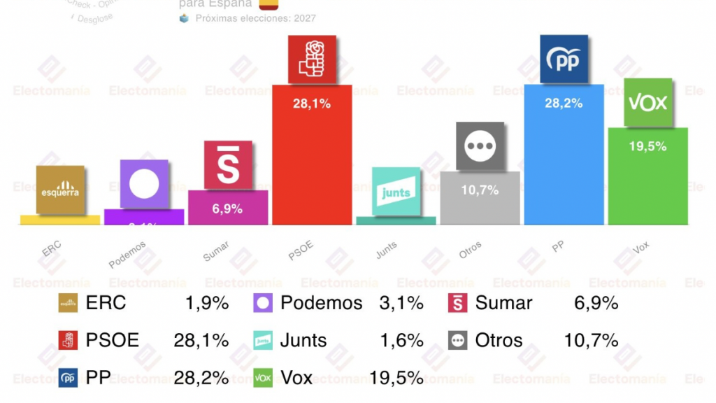 Según los nuevos datos, los socialistas obtendrían un 28,1 % de los votos unos 116 escaños, mientras que el Partido Popular se sitúa en un 28,2 % y alcanzaría los 118 diputados, lo que supone un empate técnico entre las dos principales fuerzas políticas del país.